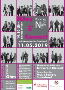 Auch in diesem Jahr heißt es wieder "NJoy in Concert". Mittlerweile ist es schon Tradition geworden und gehört als Termin in jeden gut sortierten Kalender. In diesem Jahr ist der Popchor zu Gast in der Gleidorfer Schützenhalle. Zum Programm gehören altbekannte Stücke, aber auch neue Songs werden zu hören sein. Mit dabei sind: - Showteam Mädchen des TV Gleidorf (www.tvgleidorf.de) - Music Factory Sauerland (www.music-factory-sauerland.de) Der Vorverkauf beginnt am 23.04.201